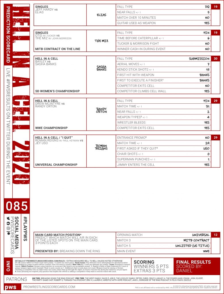 The prediction scorecard for WWE Hell In A Cell is now available to download and in the PWS digital platform. Picks for this event will close on October 25 at 6p EST / 3p PST.