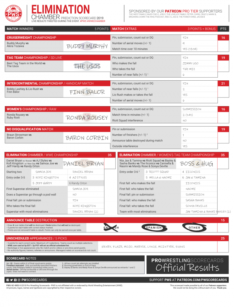 The PWS prediction scorecard for WWE Elimination Chamber is now available. Results will be live tweeted (@PWScorecards) at the close of each match. Use #PWSResults to join the conversation.