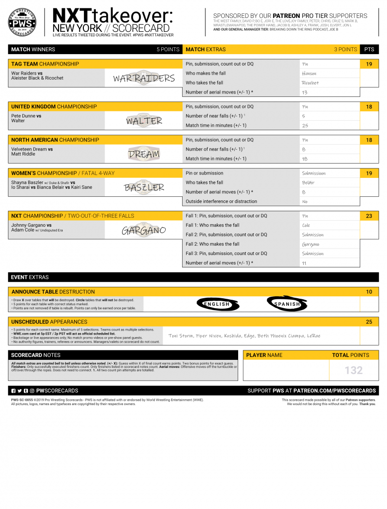 - SD Live Tag Team match was added to kick-off. We will not be adding it to the scorecard.
