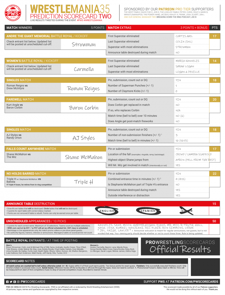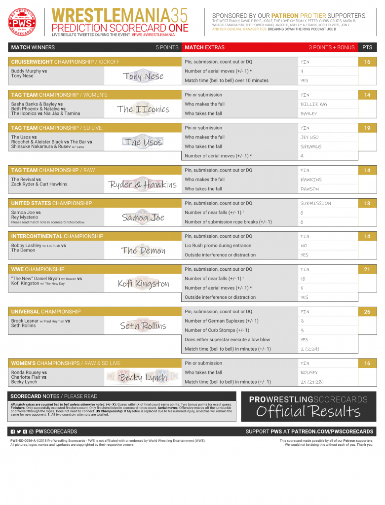 The PWS prediction scorecard for WWE WrestleMania is now available. Results will be live tweeted (@PWScorecards) at the close of each match. Use #PWSResults to join the conversation.