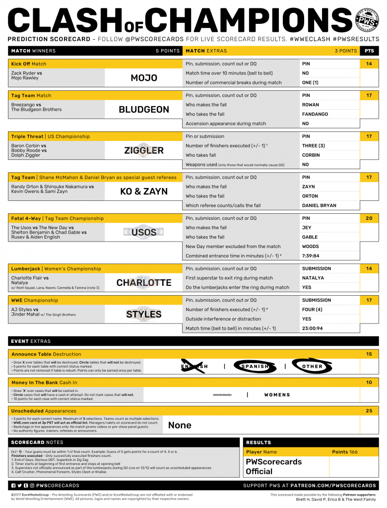 The PWS prediction scorecard for WWE Clash of Champions is now available. Results will be live tweeted (@PWScorecards) at the close of each match. Use #PWSResults to join the conversation.