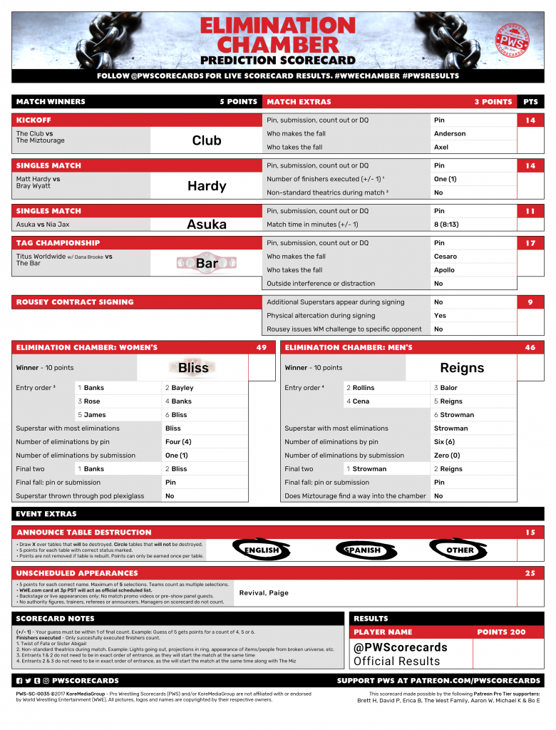 The PWS prediction scorecard for WWE Elimination Chamber is now available. Results will be live tweeted (@PWScorecards) at the close of each match. Use #PWSResults to join the conversation.