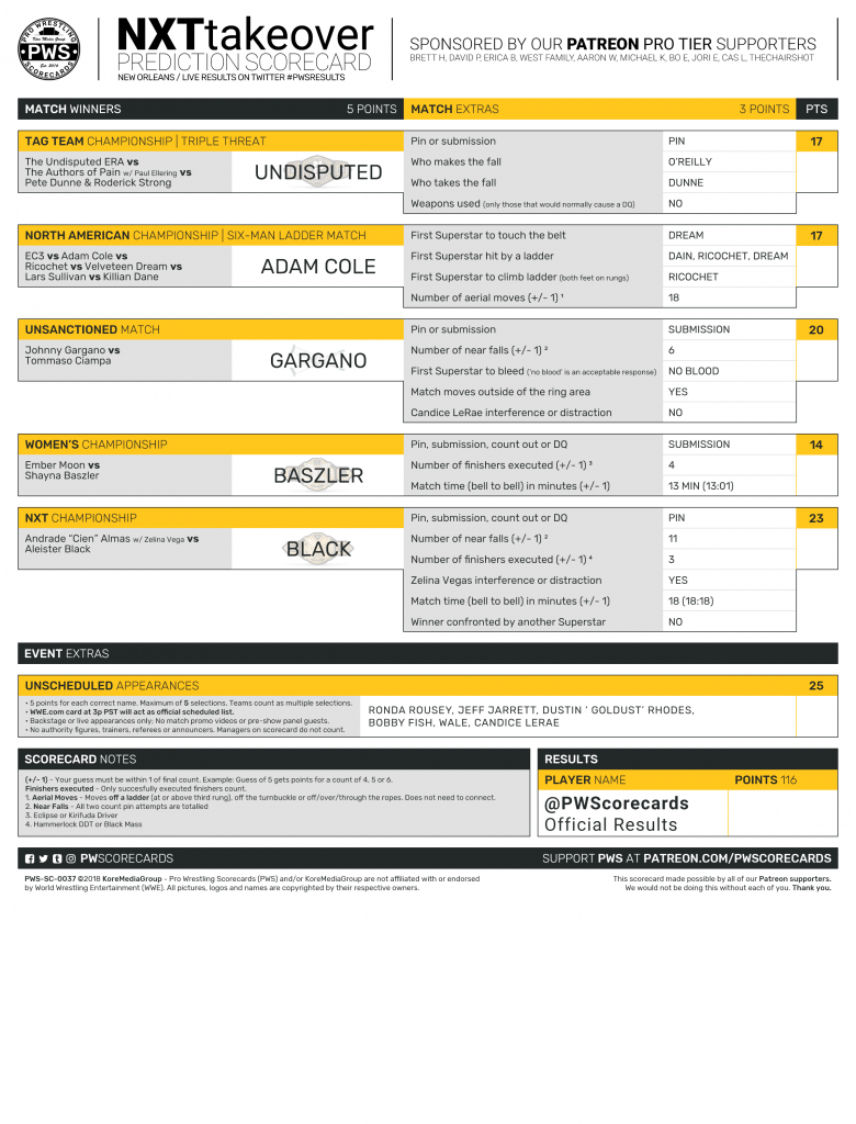 The PWS prediction scorecard for NXT TakeOver: New Orleans is now available. Results will be live tweeted (@PWScorecards) at the close of each match. Use #PWSResults to join the conversation.