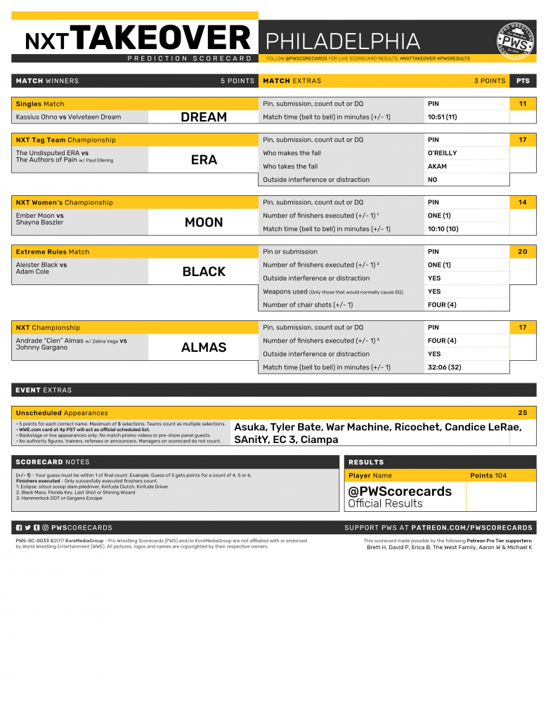 The PWS prediction scorecard for NXT TakeOver: Philadelphia is now available. Results will be live tweeted (@PWScorecards) at the close of each match. Use #PWSResults to join the conversation.