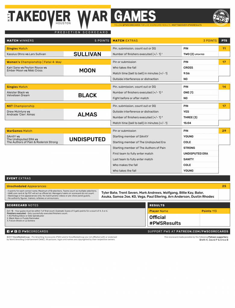 The PWS prediction scorecard for NXT TakeOver: WarGames is now available. Results will be live tweeted (@PWScorecards) at the close of each match. Use #PWSResults to join the conversation.