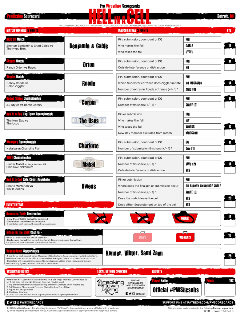 The PWS prediction scorecard for WWE Hell in a Cell is now available. Results will be live tweeted (@PWScorecards) at the close of each match. Use #PWSResults to join the conversation.