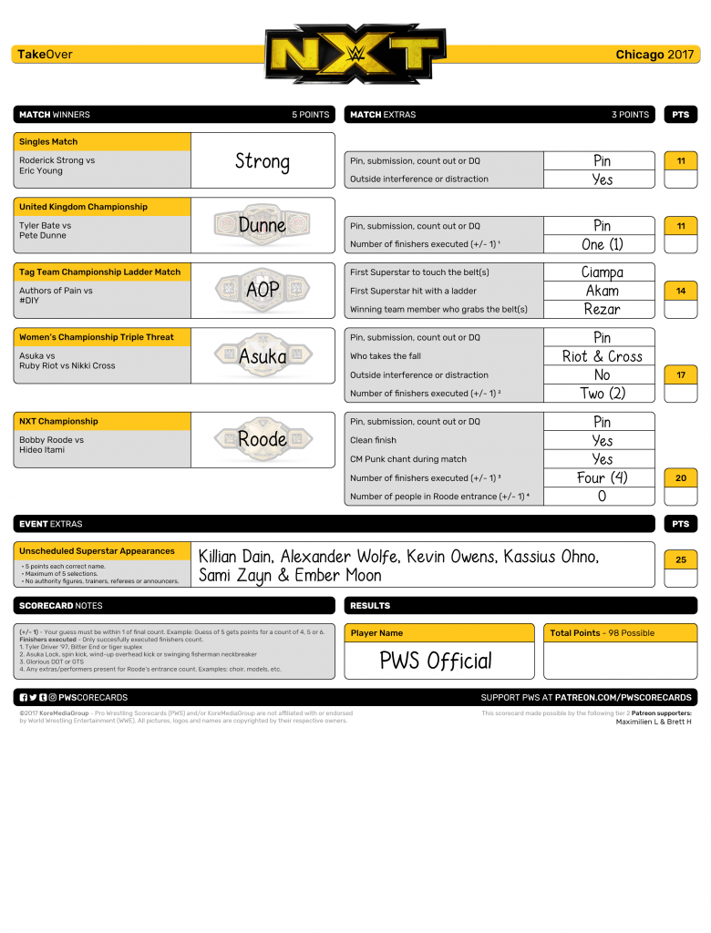 The PWS prediction scorecard for NXT TakeOver: Chicago is now available. Results will be live tweeted (@PWScorecards) at the close of each match. Use #PWSResults to join the conversation.
