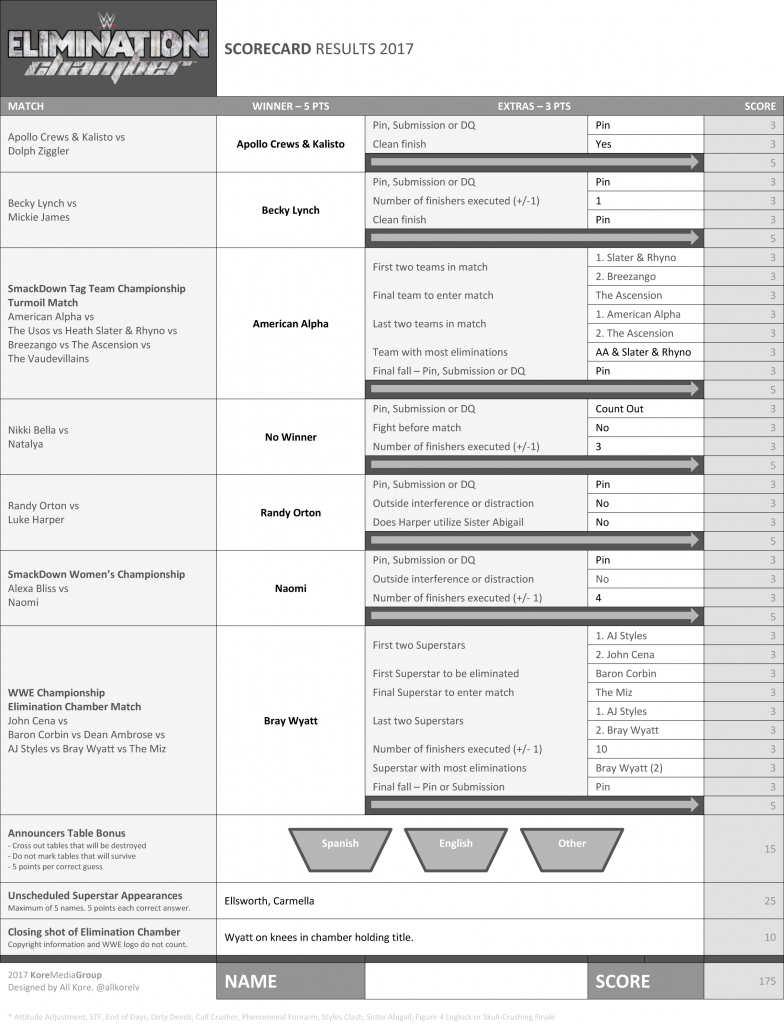 The PWS prediction scorecard for WWE Elimination Chamber is now available. Results will be live tweeted (@PWScorecards) at the close of each match. Use #PWSResults to join the conversation.