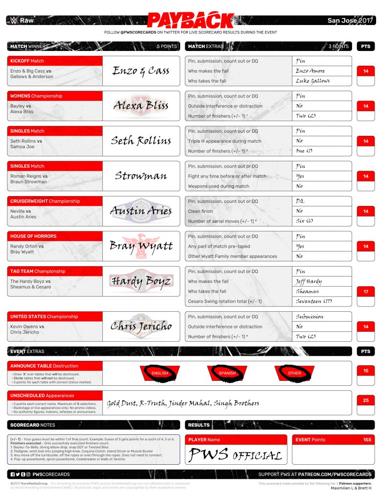 The PWS prediction scorecard for WWE Payback is now available. Results will be live tweeted (@PWScorecards) at the close of each match. Use #PWSResults to join the conversation.