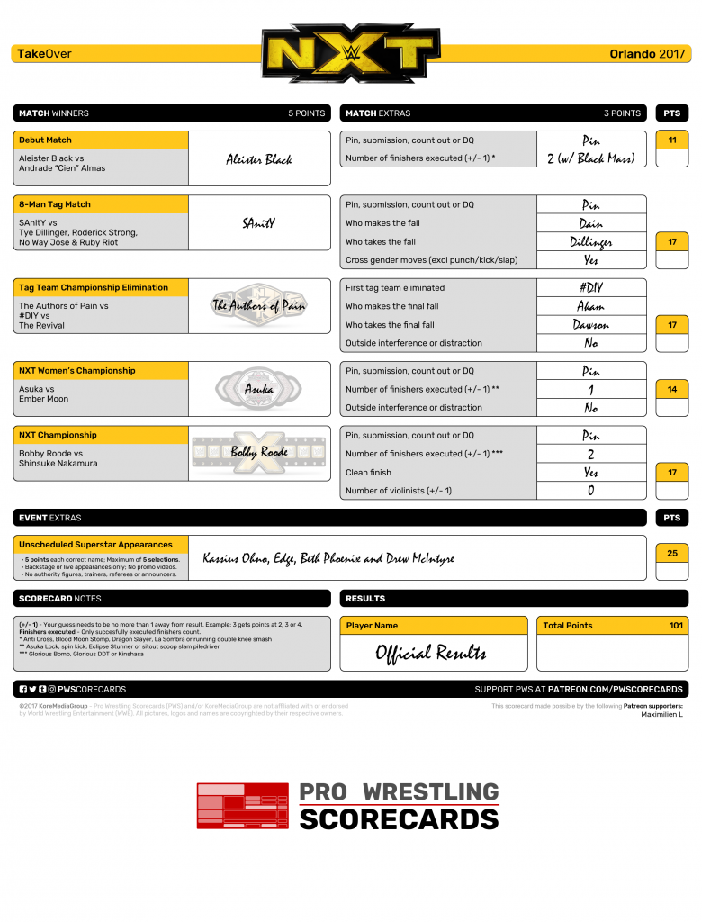 The PWS prediction scorecard for NXT TakeOver: Orlando is now available. Results will be live tweeted (@PWScorecards) at the close of each match. Use #PWSResults to join the conversation.