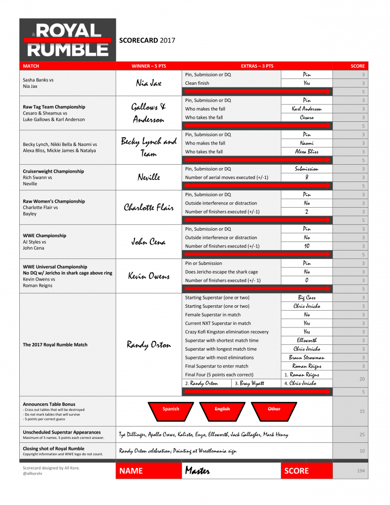 The PWS prediction scorecard for WWE Royal Rumble is now available. Results will be live tweeted (@PWScorecards) at the close of each match. Use #PWSResults to join the conversation.