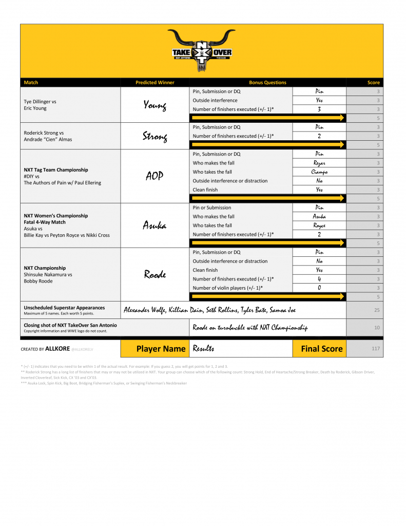 The PWS prediction scorecard for NXT TakeOver: San Antonio is now available. Results will be live tweeted (@PWScorecards) at the close of each match. Use #PWSResults to join the conversation.